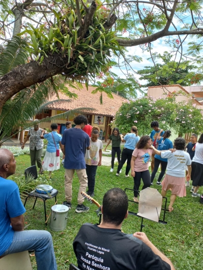 Na primeira parte do encontro, pela manhã, foi proporcionado um momento de descontração com esporte no campinho e com danças de animação, favorecendo o entrosamento do grupo. Após a acolhida, tivemos um momento de formação sobre o que é missão e a importância de vivenciarmos essa dimensão em nossas vidas, pois ela é a essência da Igreja. Para melhor aprofundamento, dividimo-nos em grupos para refletir o texto bíblico de Rm 5, 1-5, que fundamenta o tema do Ano Jubilar.