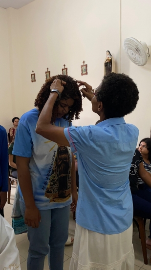 Na segunda parte do encontro, o Padre Goretti abençoou as garrafinhas com água, deu-nos a bênção de envio e, ao mesmo tempo, cada jovem recebeu um cordão com crucifixo como expressão do desejo de seguir Jesus a cada dia, abraçando com Ele as nossas cruzes e ajudando a acolher os sofrimentos de nossos irmãos. Enquanto recebiam os cordões, cantávamos a música do Padre Zezinho: “No peito eu levo uma cruz, no meu coração o que disse Jesus”, que nos convida a uma vivência profunda e enraizada da nossa fé.
