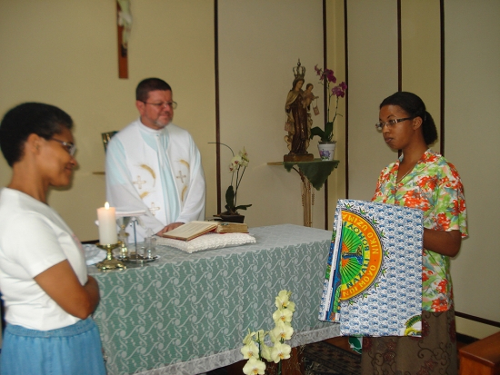 O envio constou da Eucaristia presidida pelo Padre John Kennedy Crepaldi, na Capela da Fraternidade Divina Providência, Rua Serranos, na Serra em Belo Horizonte. Estavam presentes as Irmãs da Comunidade Carmelita e de um grupo de Irmãs Sacramentinas, a saber, Cacilda Mendes Peixoto, Maria da Penha Holmes, Ana Maria de Paula, Maria Aparecida Rosa, Patrícia Dias, Valéria Cândido Miranda e Clotilde de Souza. Na simplicidade, na alegria da partilha, no clima fraterno e cheio de esperança aconteceu a cerimônia. As duas Superioras Gerais se expressaram mostrando contentamento e gratidão a Deus pelo dom da vocação missionária. Ir. Cacilda acolheu Ir. Melina oferecendo a ela uma imagem de Nossa Senhora da Eucaristia; Ir. Dazir da Rocha Campos dirigiu palavras de ânimo e de agradecimento pela disponibilidade do Sim de Ir. Melina. Ir. Valéria, que participou da missão durante quatro anos, ofereceu um símbolo característico das mulheres de Angola, a capulana, um pano que usam como veste.