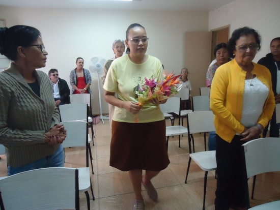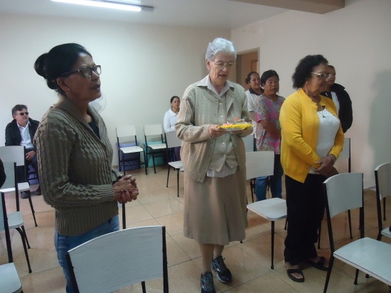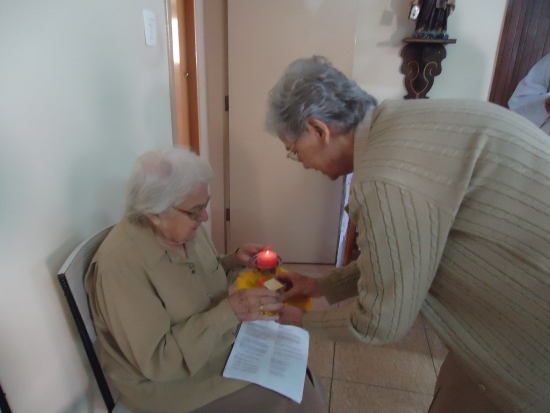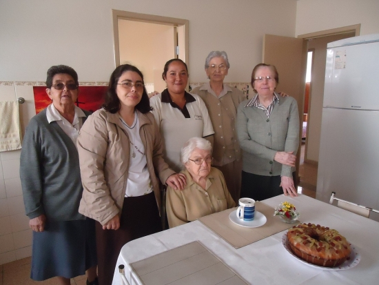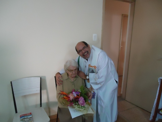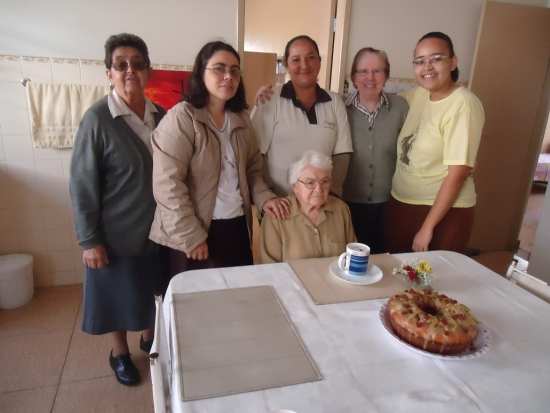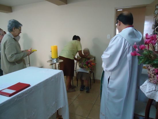 Celbramos, pela manhã, a Missa presidida pelo Frei José Roberto, Franciscano. Com entusiamo, ele falou do testemunho de vida da Irmã Adyr. Irmã Natalícia e a aspirante Beatriz ofereceram, a Irmã Ady, pela comunidade um ramalhetede flores colhidas do nosso jardim, e uma vela símbolo da sua fé.